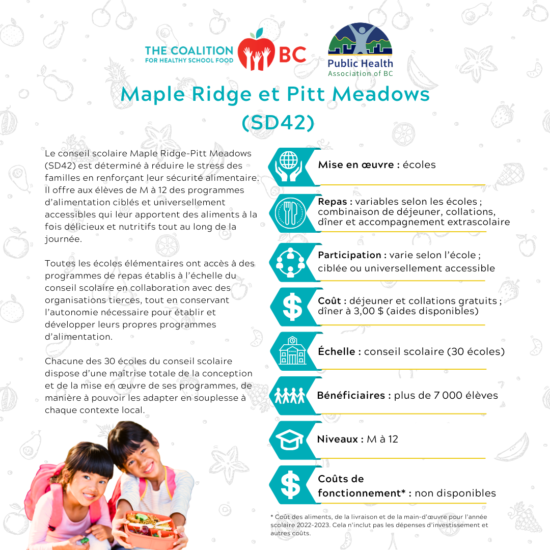 Le conseil scolaire de Maple Ridge et Pitt Meadows (CS42) est déterminé à réduire le stress des familles en renforçant leur sécurité alimentaire. Il offre aux élèves de M à 12 des programmes d’alimentation ciblés et universellement accessibles qui leur apportent des aliments à la fois délicieux et nutritifs tout au long de la journée.