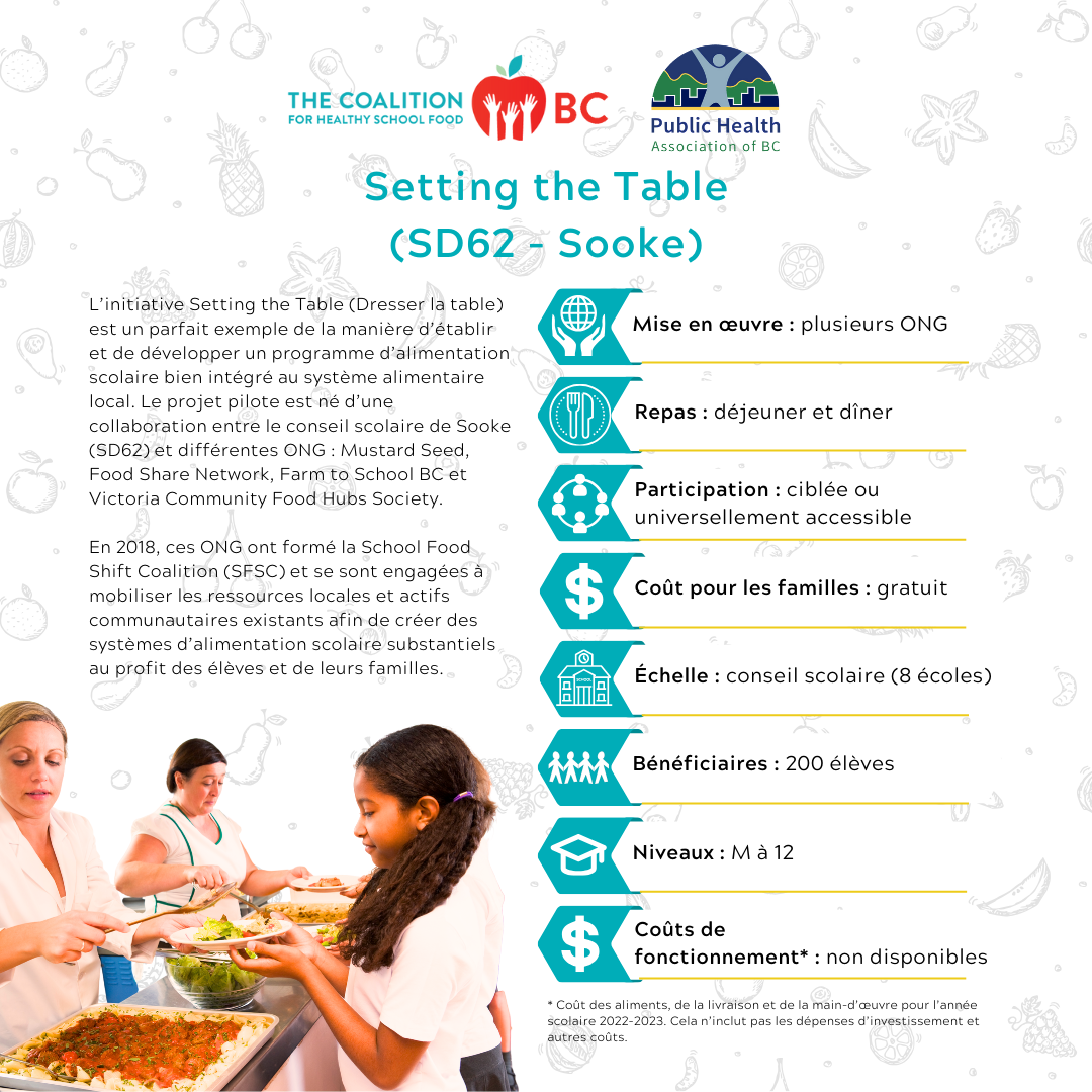 Voici des exemples de modèles de prestation utilisés par les programmes d’alimentation scolaire. Cliquer sur les images pour plus de détails.