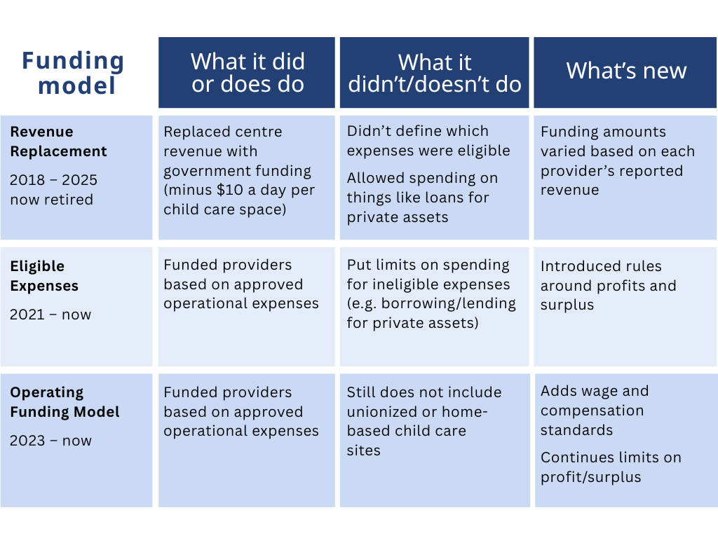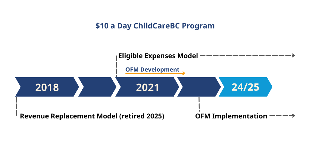 The Operating Funding Model started in 2023 with a small group of child care centres that are part of the $10 a Day ChildCareBC program. The model: