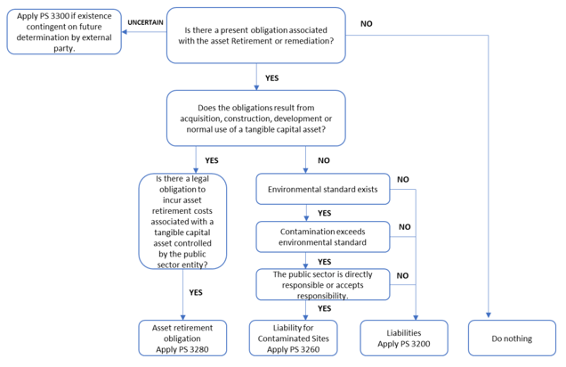 In certain circumstances, an entity may have doubts on whether there is an existence of an ARO. An assessment should be undertaken to determine whether obligations should be recognized or disclosed under PS 3260 Liability for Contaminated Sites, PS 3200 Liabilities, PS 3300 Contingent Liabilities, or PS 3390 Contractual Obligations.