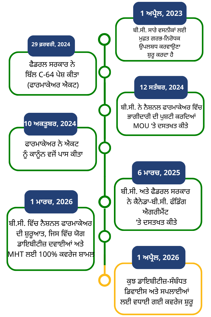 6 ਮਾਰਚ, 2025 ਨੂੰ, ਬੀ.ਸੀ. ਸੂਬੇ ਅਤੇ ਕੈਨੇਡਾ ਦੀ ਫੈਡਰਲ ਸਰਕਾਰ ਨੇ ਬੀ.ਸੀ. ਵਿੱਚ ਨੈਸ਼ਨਲ ਫਾਰਮਾਕੇਅਰ ਲਾਗੂ ਕਰਨ ਲਈ ਇੱਕ ਸਮਝੌਤਾ ਕੀਤਾ, ਜਿਸਦੇ ਤਹਿਤ ਫੈਡਰਲ ਸਰਕਾਰ ਤਿੰਨ ਸਾਲਾਂ ਵਿੱਚ $670 ਮਿਲੀਅਨ ਤੱਕ ਦੀ ਆਰਥਿਕ ਸਹਾਇਤਾ ਮੁਹੱਈਆ ਕਰੇਗੀ। ਇਸ ਸਮਝੌਤੇ ਅਧੀਨ, ਯੋਗ ਗਰਭ-ਨਿਰੋਧਕ ਉਤਪਾਦਾਂ, ਟਾਈਪ 1 ਅਤੇ ਟਾਈਪ 2 ਡਾਇਬੀਟੀਜ਼ ਦੀਆਂ ਦਵਾਈਆਂ, ਅਤੇ ਹਾਰਮੋਨ ਰੀਪਲੇਸਮੈਂਟ ਥੈਰੇਪੀ (HRT), ਜਿਸਨੂੰ ਹੁਣ ਮੈਨੋਪੌਜ਼ਲ ਹਾਰਮੋਨ ਥੈਰੇਪੀ (MHT) ਕਿਹਾ ਜਾਂਦਾ ਹੈ, ਲਈ 100% ਕਵਰੇਜ 1 ਮਾਰਚ, 2026 ਤੋਂ ਬੀ.ਸੀ. ਵਿੱਚ ਸ਼ੁਰੂ ਹੋ ਗਈ।
