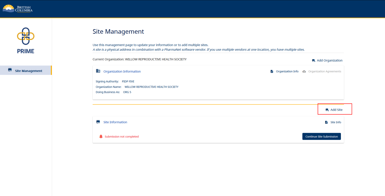 For definition of a site and explanation of roles (signing authority, privacy officer, etc.), see the PRIME site registration quick guide (PDF, 175 KB).