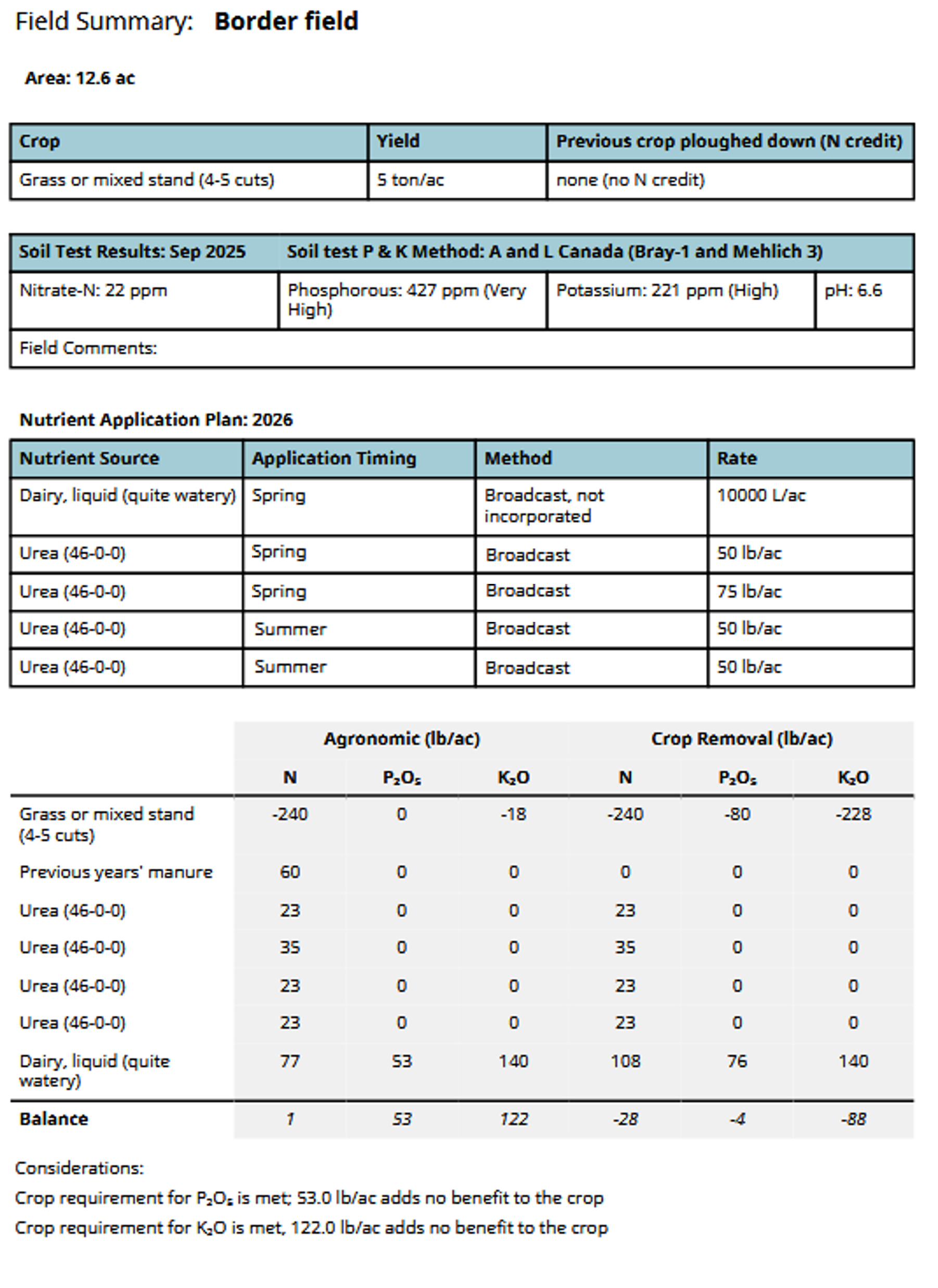 In the BC Nutrient Management Calculator, the Nutrient Application Plan for each field can be found in the Field Summary section of the summary report.