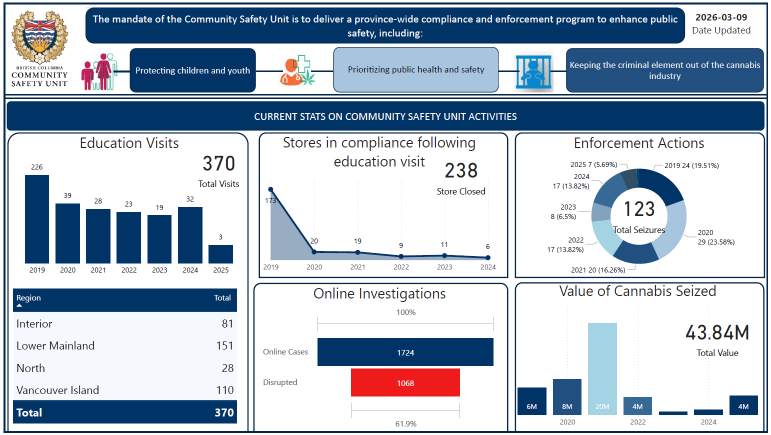 Ongoing efforts remain a priority. CSU investigators engage with unlicensed retailers in communities throughout British Columbia, actively carrying out compliance and enforcement activities against unauthorized cannabis retailers and producers across the province.